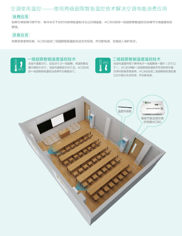 5)在控制室可遠程調(diào)節(jié)設(shè)置單間或者全部教室的空調(diào),如空調(diào)允許通電時間段,教室里的空調(diào)可設(shè)置下限溫度值,空調(diào)的遠程關(guān)閉等;